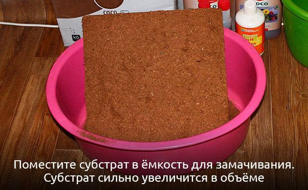 4. Достав брикет из упаковки, поместите его в ёмкость для замачивания. Учитывайте, что субстрат сильно увеличится в объёме, поэтому выбирайте большую ёмкость, минимум на 10-15 литров;