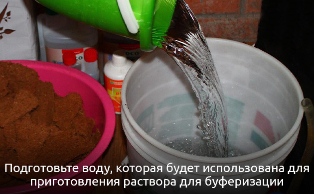 2. Исходя из инструкции на упаковке, рассчитайте количество буферного раствора. Например: «Для получения 10 литров кокосового субстрата потребуется 5 литров воды». Значит, вам необходимо подготовить 5 литров буферного раствора, а лучше – даже немного больше;
