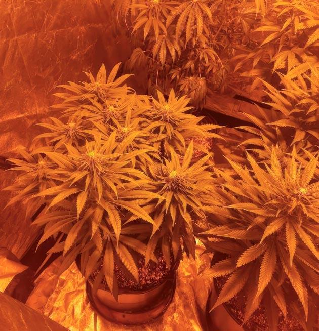 Сейчас кусты полностью остановились в росте, и все питание уходит в налив шишек. Структура плотная, листья здоровые, цвет насыщенный, на свету блеск трихом невероятно радует глаз. При ближайшем осмотре заметил еще одну мутирующую шишку, которая тоже выглядит будто сдвоенной. Причем она была уже на другом растении. Причудливая генетика.