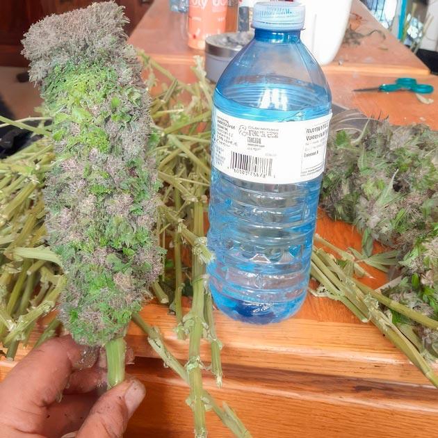 Ну что, вот и наступил финал на 15-й неделе. Урожай собран, а руки теперь липнут, будто их окунули в банку с клеем. И это лучший знак завершения цикла. Все шишки обрезал вручную, уделяя внимание каждой коле. Работа долгая, но результат того стоит, соцветия получились плотные, смолистые, красивые, с выраженными оттенками изумрудно-зеленого и пурпурного. После тримминга отправил их сушиться. План такой: ежедневно буду проверять их состояние и раскладывать по банкам те, которые уже достаточно просохли. При учете такой невероятной плотности соцветий, думаю, это займет дней 10 - 12, не меньше.