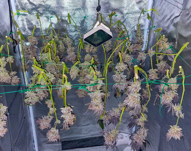 К счастью, новых гермопризнаков больше не появилось. Все под контролем, растения выглядят стабильно и набирают массу шишек. Чтобы улучшить циркуляцию воздуха и избежать проблем с излишней влажностью, я провел лоллипоппинг, убрал все оставшиеся листья и слабые побеги под сеткой ScrOG. Теперь нижняя часть кроны чистая, воздух свободно гуляет, а энергия направлена туда, где она действительно нужна.