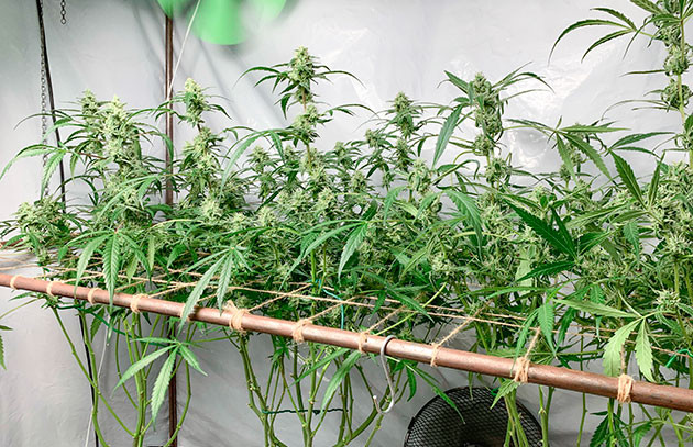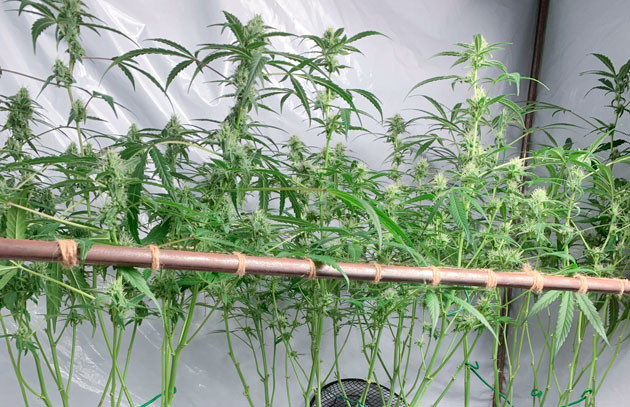 На этом этапе я вернулся к LST, а также наблюдаю отличную реакцию кустов на ScrOG. Помимо того, отрезал еще несколько лишних листьев, и теперь снизу растишки совсем голые. Ну и, разумеется, я в очередной раз поменял удобрения и их количество: