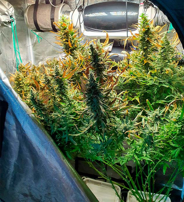 Во-вторых, стоит быть аккуратным с удобрениями, чтобы не получилось как в моём случае. Меня ввело в заблуждение именно то, что сначала пятна были похожи на ожоги от лампы. Несмотря на такие ужасные поражения, Gorilla Cookies Auto восстановилась. В-третьих, будьте готовы к постоянной дефолиации. Очень густое растение с большим количеством зеленой массы. Невероятно много листвы, которая отрастает очень быстро.