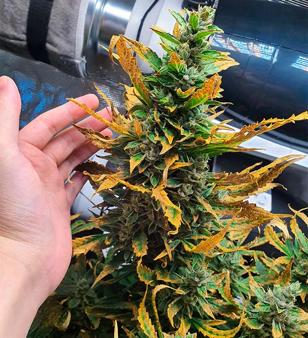 Конечно, это уже не вернёт и не восстановит пострадавшую листву, но хотя бы проблема не будет усугубляться. Впрочем, шишки большие и продолжают увеличиваться, в них много смолы, уже видны первые янтарные трихомы. Запах трудно описать: это фруктовая смесь с каким-то особенным оттенком.