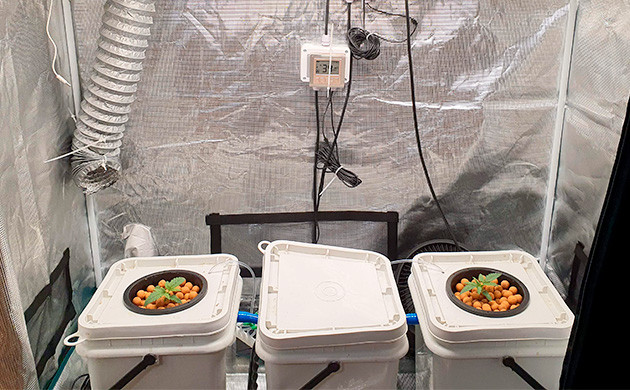Выращивал на гидропонике под светодиодной панелью на 250 W. Горшки DWC на 20 литров, плюс общий резервуар. Присутствуют все необходимые датчики для контроля микроклимата, вытяжка активная, приток воздуха пассивный через форточки в палатке.
