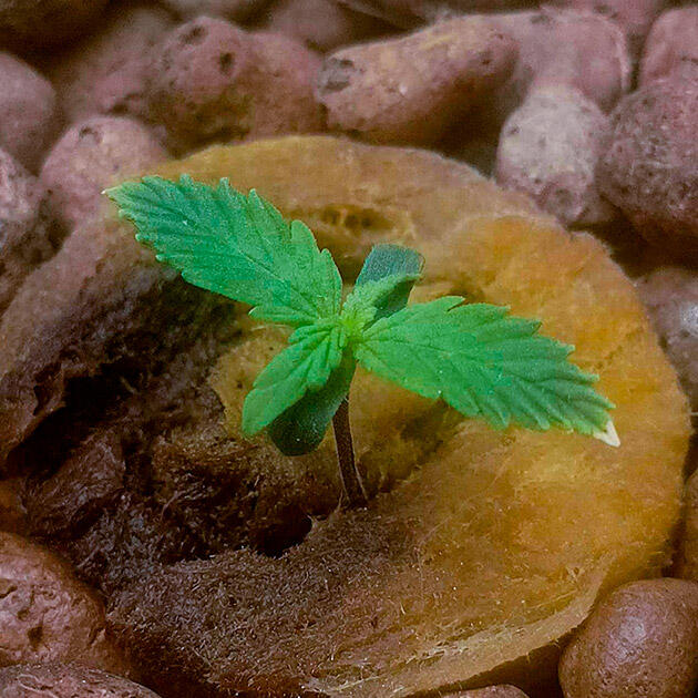 Прорастил семки, что называется, по классике: 2 рюмки, по 50 мл воды плюс 10 капель перекиси водорода в каждой, семки по рюмкам. 2 дня, и корешки уже вдвое длиннее семок. Поместил их в минеральную вату, смоченную раствором для первой недели роста: 15 литров воды с добавлением 3 мл ProRoots. В вате семки провели еще 2 дня. Одно семя, вообще, успело даже каску скинуть самостоятельно.