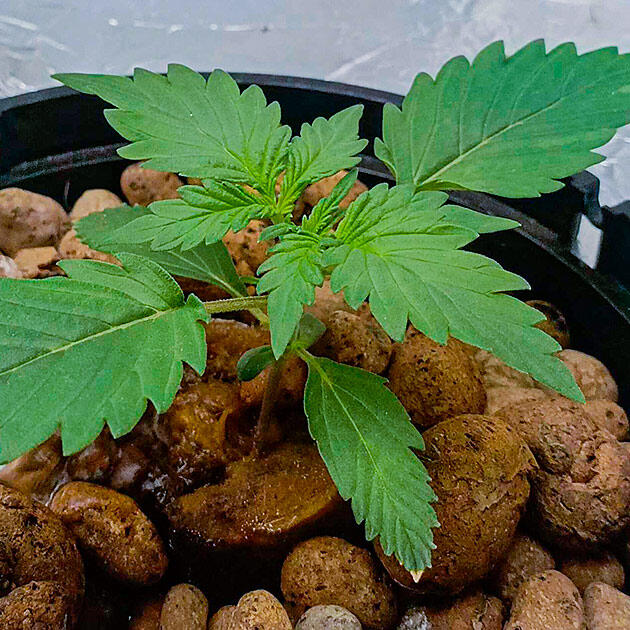 Минвату поместил в керамзит посадочного места DWC, настроил свет с помощью диммера на 25К Lux. Продолжил поливать водой с добавлением ProRoots (3 мл/15 литров воды). Дело пошло. Ростки быстро поднялись, выпустили по первой паре листочков, а к концу первой недели корешки уже пролезли в раствор, ну а на растишках прорезалась вторая пара листьев. Развитие корневой системы у сорта просто великолепное.