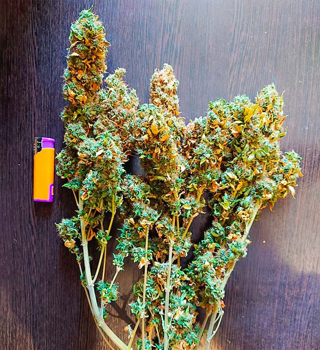 Спустя неделю урожай высох. Сушил в полной темноте при комнатной температуре (26-30 градусов). После сушки вышло 75 г сухих бутонов без учета трима.