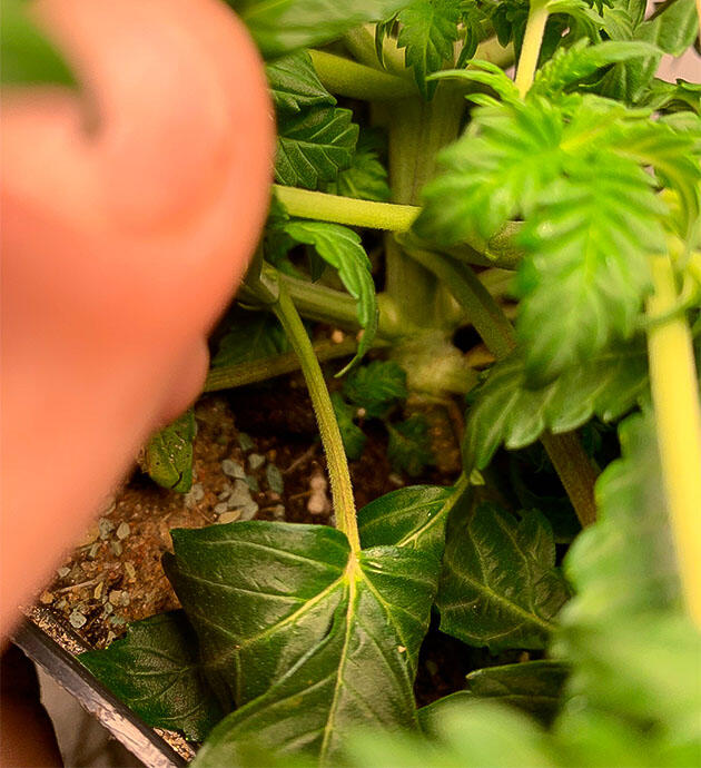 Автоцветы иногда сажаю сразу в 20 - 25-литровые бэги. Тут сначала решила его все-таки в горшке прорастить. Корешок у конопли, я так понимаю, очень быстро растет вглубь. Автоцветы, мне кажется, любят сначала пространство земли занять как следует, а потом верх развивать скорее. Но из-за того, что они и так быстро зацветают, не успевают зелени нарастить. Поэтому большой объём земли автоцвету вроде как не нужен.