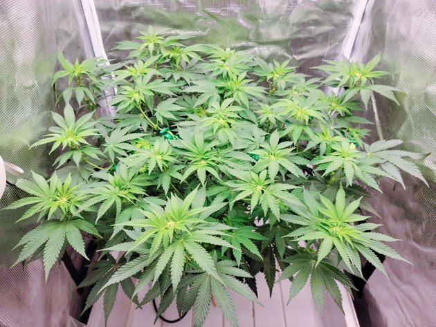 К середине восьмой недели куст был густой, широкий и невысокий, мечта индорщика. Всю неделю гнул макушки специальными клипсами для LST, чтобы переводить растение в цвет с максимальным количеством точек формирования соцветий. Получилось как нельзя лучше! Кустик начал пахнуть, пока аромат просто конопляный, ничего особенного.