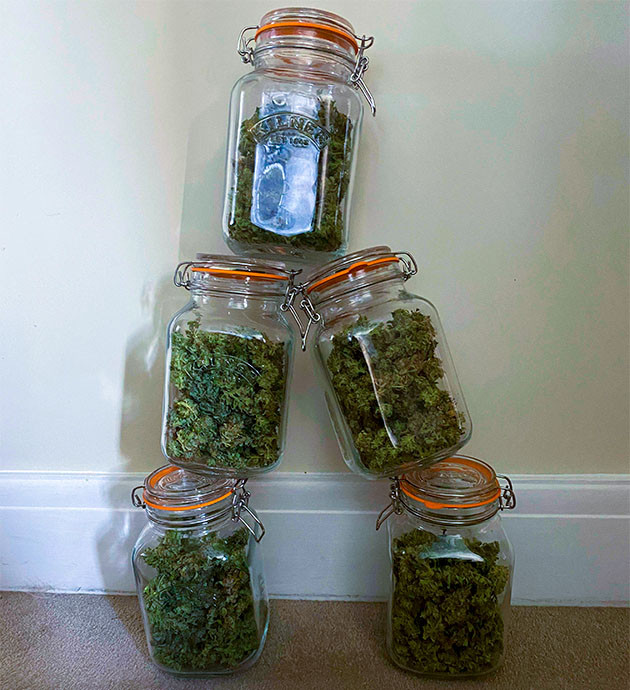 На десятой неделе я последний раз накормил этих монстров и начал промывать. За 10 дней лил три раза по 5 литров, на дренаже вытекало примерно по литру. Трихомы разные в зависимости от этажа. Чем выше, тем больше янтаря. Впрочем, прозрачных не осталось, все как минимум налились молоком. В конце 11-й недели оставил растишки на два дня в темноте и срубил эти деревья, благо справился без топора и пилы.