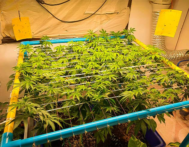 Итак, сначала растишки стояли в трёхлитровых горшках, чувствовали себя отлично, но злой гровер (то есть я) заставил их переехать, пересадил в горшки по 15 литров. После пересадки полил-покормил (по 2 литра на куст), да еще и сетку установил, скрог которая. Растянул макушки в ячейки и остался доволен проделанной работой. Всё-таки ловко это я придумал.