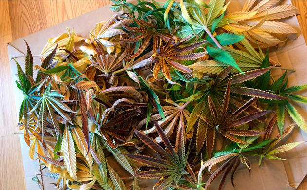 Последняя неделя развития куста. Промывал три раза по 10 литров. Несмотря на внешний вид, количество янтарных трихом было не слишком велико. Более того, значительная часть не была даже молочной. Основное количество трихом стало мутными и янтарными уже к концу недели и после того, как я оставил растиху в темноте на 36 часов. Перед тем как рубить урожай, оборвал большое количество листвы. Выглядело так, будто я гулял по осеннему саду и собирал листья разных деревьев.