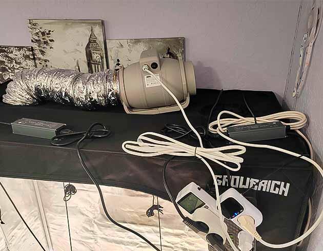 16.05.2025 Первая неделя веги, пока все штатно, малые выглядят (вроде) нормально. Но есть проблемы по температуре. Сейчас лампа на расстоянии 35 см висит, и температура в районе кустов не ниже 30 градусов, а влажность 45 %. В боксе греется только лампа, я уже вывел наружу все, что может греться. Сейчас висит один кулер на обдув, завтра повешу еще три. Надеюсь, поможет.