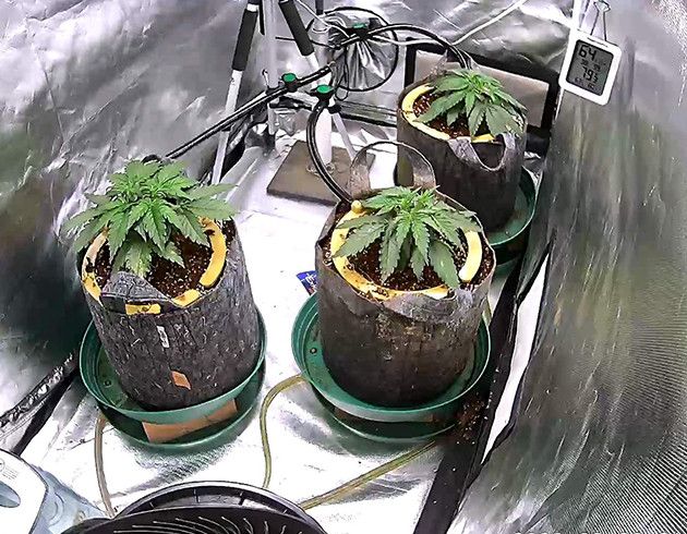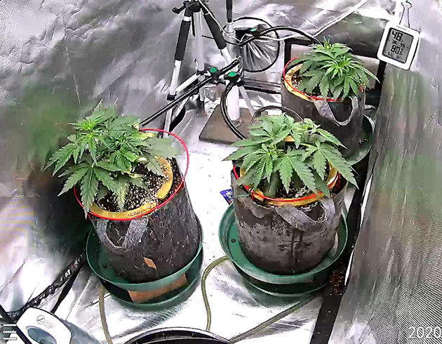 Третья неделя, и девочки чувствуют себя просто превосходно. Они переехали в горшки по 20 литров, и я сделал LST. Все идет отлично, никаких проблем. Горшки подключены к автополиву, все также получают по три порции “компота” в сутки. На этой неделе довел ppm до 600 и немного снизил влажность, до 60 %. Забыл упомянуть, что в боксе стоят автоматический увлажнитель и вентилятор для обдува. А также установлена камера, которая постоянно снимает кустики. Вообще, весь бокс у меня автоматизирован, и я могу контролировать всё дистанционно. Что касается полива, то кусты получают примерно по 1,5 литра в сутки.