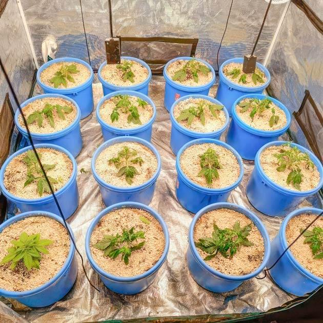 Провел уборку в боксе после харвеста, подготовил все необходимое, заполнил ведра смесью почвы и перлита в пропорции 2 к 1, воткнул в центр кубики RootRiot с предварительно запихнутыми внутрь семенами, а потом хорошенько пролил водой с добавлением микоризы, Microbes, Bio Heaven и Root Juice от BioBizz. Из-за обильного полива часть перлита всплыла, и кажется, что почвы там нет вообще. Но поверьте мне, друзья, она там есть.