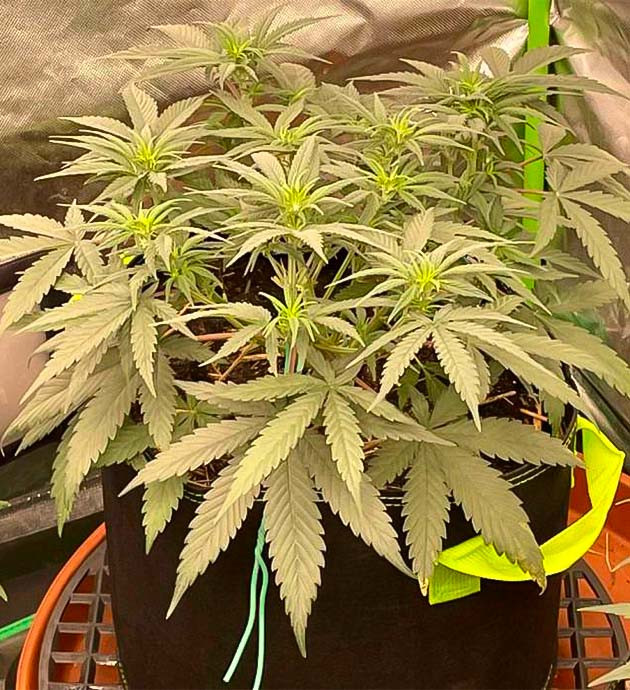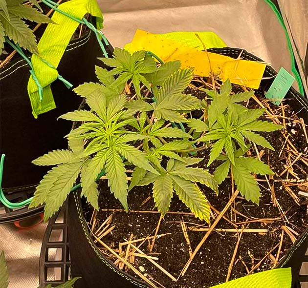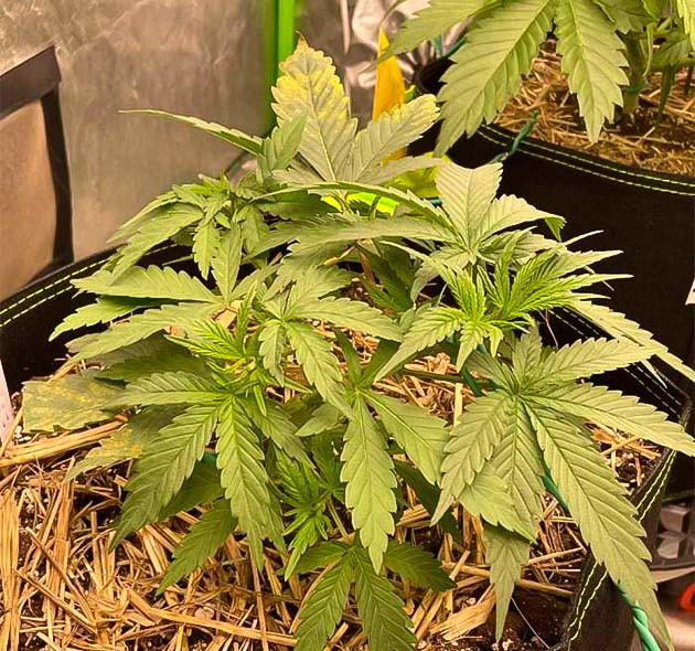 Радует то, что они не прекратили свое развитие и хорошо наращивали зеленую массу. Причем молодая листва была уже практически полностью здоровая. Я решил не отказываться от тренировок и начал аккуратненько гнуть кусты в технике LST. В любом случае если они слишком сильно вытянулись бы, то просто получили бы дополнительно еще и термический ожог от лампы. А изгибание перенесли вполне нормально.