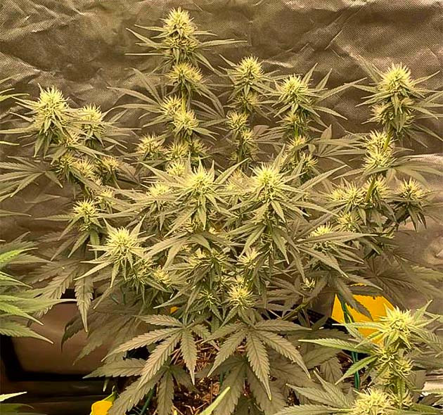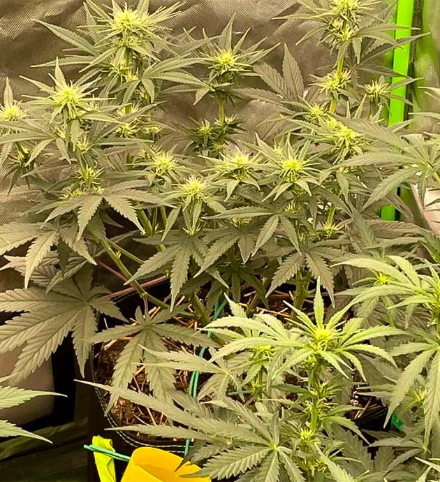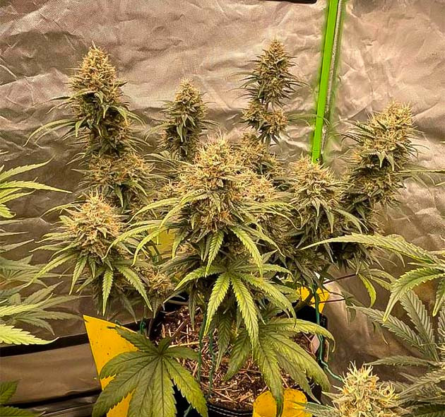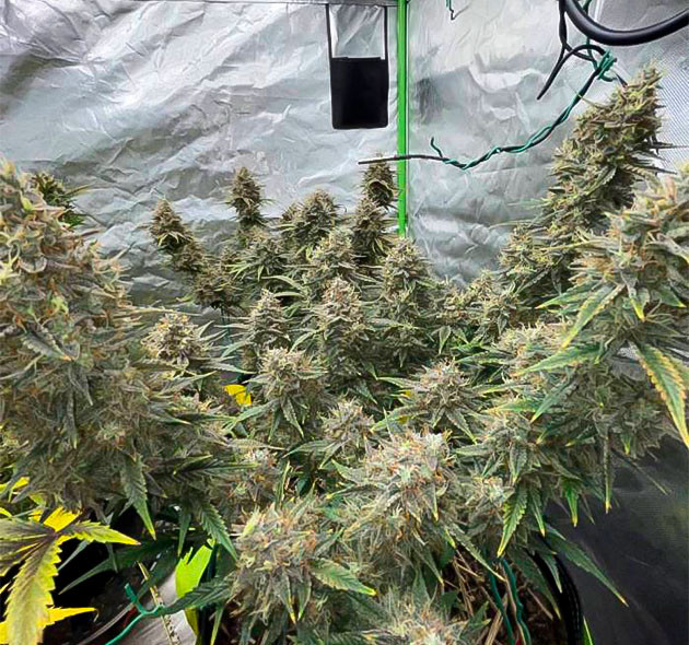 Меньший из двух Mint Jelly Auto уже приближается к харвесту. Его шишки крупные, плотные и нереально пахучие. Они густо покрыты смолой, а сами трихомы уверенно погружаются в молочную реку. Причем, несмотря на небольшие размеры, даже этот коротыш выглядит так, будто он даст действительно отличный урожай. А вот большему по внешнему виду потребуется еще одна или две дополнительные недели.