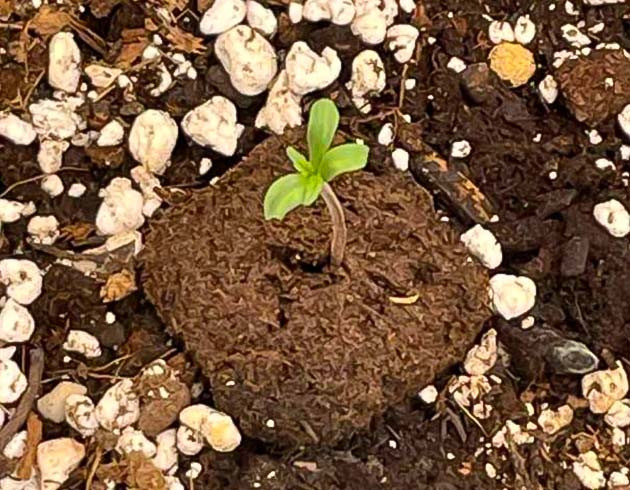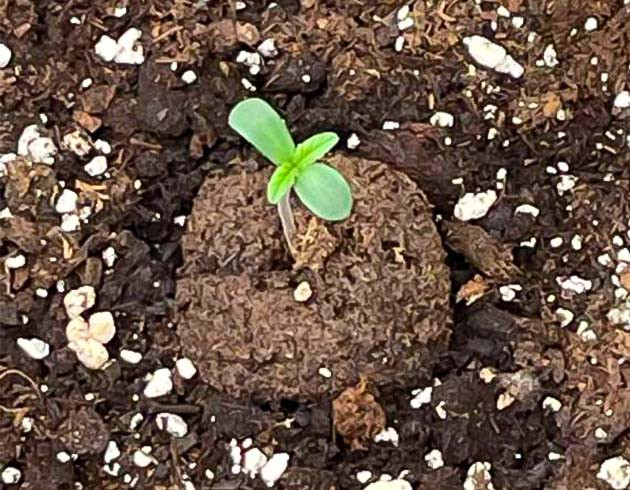 Без долгих раскачек и траты времени я сразу же закидываю два орешка Mint Jelly Auto в подготовленные кубики Root Riot. На четвертые сутки в мини-тепличке оба ростка оказываются на свободе. Еще сутки они провели в своем укромном домике, но уже без «крыши», а после я переместил их на ПМЖ в конечный горшок, просто немного углубив торфяной кубик в грунт, но не закапывая его полностью.