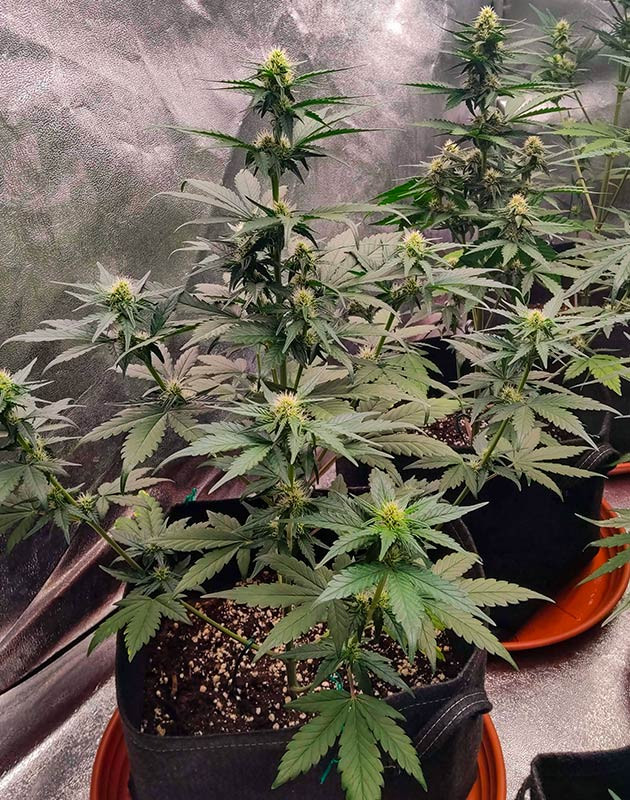 На седьмой неделе листва начала желтеть и на остальных кустах, но ничего критичного. Вместе с пожелтением начали проступать лёгкие фиолетовые оттенки, но это не выглядит как генетическая особенность, скорее, как признак переизбытка питательных веществ. Судя по всему, я немного засолил почву, а из-за этого кустики не могут полноценно питаться. Но оставлять их полностью без подкормки я не решился, так как харв не за горами и им еще предстоит полноценная промывка. Удалил некоторые пожелтевшие листья, но без лишнего фанатизма. Запах стал отчетливее, теперь я различаю в нём цитрусовые нотки даже на фоне ароматов других растений в палатке. Кустики получили одну подкормку и две порции чистой воды, по три литра: