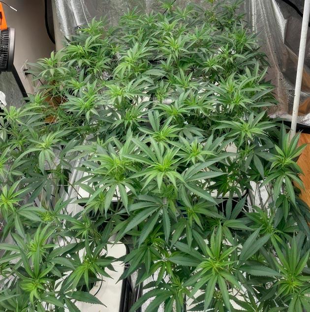 На неделе также была проведена масштабная работа с кроной. Я зачистил большое количество листьев и веток в нижней половине кустов и натянул первую сетку ScrOG. Она будет помогать держать колы на равном удалении друг от друга и одновременно служить каркасом жесткости для поддержки кустов на поздних стадиях созревания.
