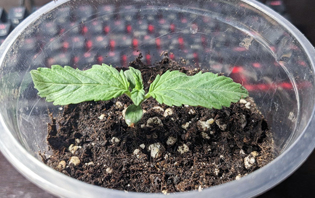 Аккуратно корешком вниз высадил ее в пластиковый стакан объемом 0,5 л, грунт использовал Biobizz Light Mix, немного смочив его из пульвика. Сверху места высадки поставил пластиковый стаканчик с отверстиями на дне для вентиляции. Внутрь него также прыснул из пульверизатора.