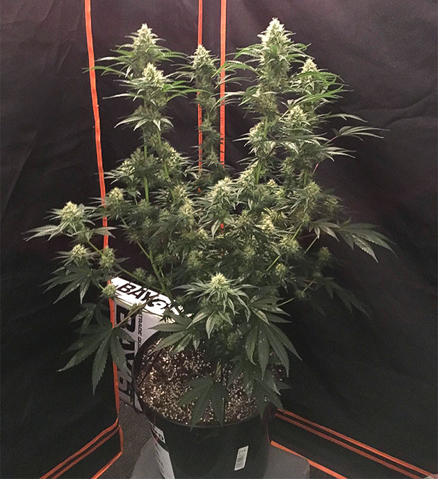 Последние две недели куст провел в другом тенте, где висит лампа ДНаТ на 600 ватт и растут еще три куста. На 14-й неделе растение получало Dragon Force (аналог привычного «Рипена») и Sumo Active Boost. Лил по 2 литра пять раз в неделю, без окна с чистой водой. Соцветия выглядят отлично, как и куст в целом. Значительная часть пестиков оранжевая, харвест не за горами.