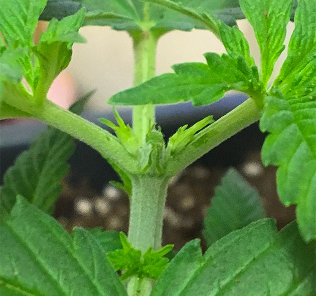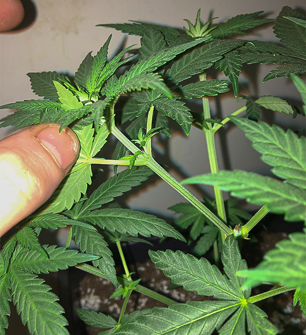 Несмотря на момент с корнями, я сделал топпинг. Обрезал четвертый этаж, чтобы получить два стебля вместо одного. Ничего особенного, обычный топпинг. Куст отреагировал спокойно, учитывая пересадку и дальнейшую засуху, восстановился быстро и без дефектов, на месте обрезки проклюнулись два новых побега, как и было запланировано.