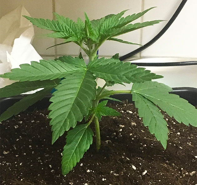 Начнем с проращивания. Тут всё по классике, ничего нового я вам не открою. Закинул семечку в стакан с водой, замочил на 12 часов. После этого переместил в «бутерброд» из влажных ватных дисков и положил в зип-пакет. Проверил через сутки, корешок только показался. Проверил еще через сутки – хвостик длиной примерно в сантиметр. При проращивании в ватных дисках важно не пропустить момент и вовремя достать проросток, иначе корешок может врасти в вату, а это нам точно не нужно. Проросшую семечку закинул в литровый стаканчик с землей, куда предварительно налил 50 мл воды с Katana Roots и Samurai Terra Grow. Росток показался быстро, на второй день уже сбросил каску. За первые две недели саженец получил две порции стимуляторов, и один раз я поливал его чистой водой. Больше рассказать особо нечего, обычное развитие, сформировалась первая трехпалая пара листьев, и проклюнулся следующий уровень.
