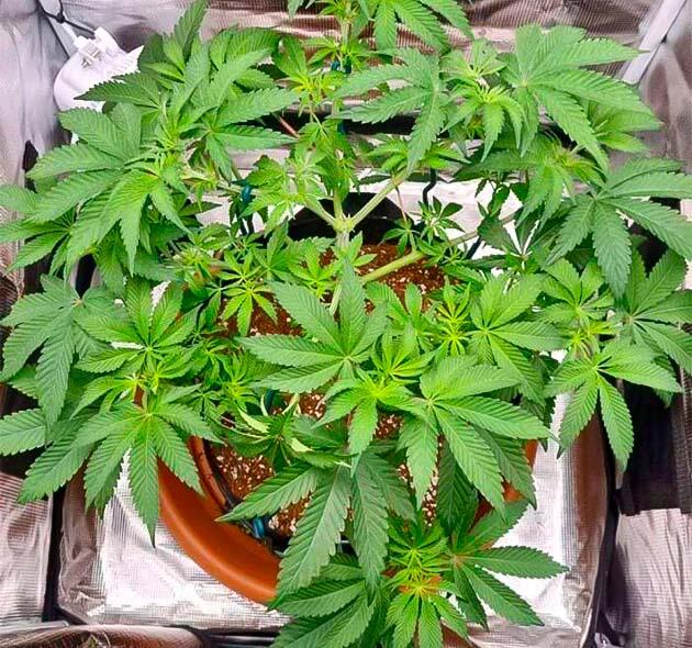 Пересадка прошла легко. Таблетка была помещена в центр, а корневая система каннабиса сразу получила пространство для развития. Теперь куст обосновался в своем основном «доме» и получил все условия для уверенного роста.