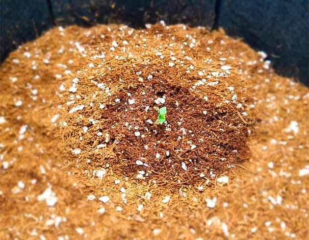 Развитие пошло достаточно быстро. К концу первой недели корешки уже проросли до дна таблетки. Это стало сигналом для пересадки в постоянный горшок. Для растения был заранее подготовлен 20-литровый гроубэг с буферизированным кокосовым субстратом и с добавлением перлита для аэрации и защиты от застоя влаги.