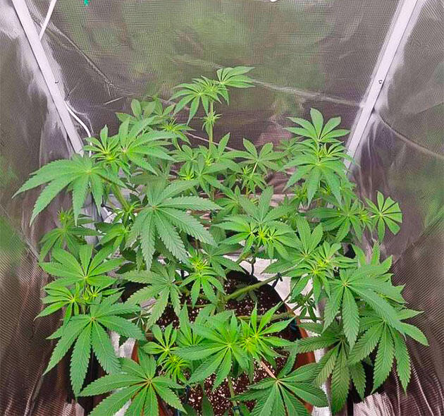 Десятая неделя ознаменовалась тем, что Strawberry OG Cookies окончательно занял все пространство тента. Куст вытянулся до 45 см и сформировал равномерную крону. Я провел, скорее всего, последнюю крупную дефолиацию. Убрал нижние листья, мелкие ростки и лишнюю листву внутри кроны, чтобы улучшить циркуляцию воздуха и доступ света к будущим соцветиям. После такой стрижки куст выглядит аккуратным и сбалансированным, а нагрузка на вентиляцию в боксе заметно снизилась.
