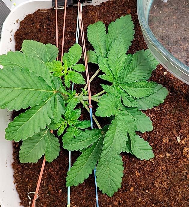 После обработки стимулятором на прошлой неделе раста ушла в буйный рост. Сам не ожидал такого. Провожу ежедневные тренировки. Заказал садовые скобы, потому что резинками оказалось неудобно тянуть в широком горшке.
