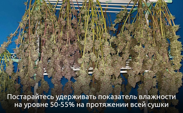- Влажность, влажность и еще раз влажность. Как уже было сказано выше, правильная влажность – залог успеха при просушке шишек конопли. Старайтесь держать этот показатель на уровне 50-55 %. Однако правильная температура более важна: лучше в помещении будет прохладно, но влажность не будет идеальной, чем в нём будет жарко, но с идеальной влажностью.