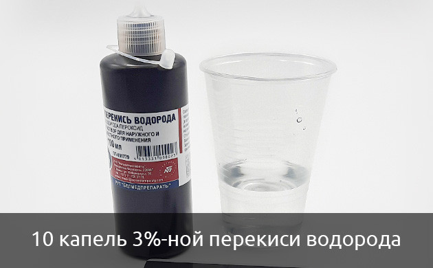 В этом случае вам понадобится 3%-ная перекись водорода, стаканчик и вода. Воду лучше купить в магазине, она должна быть без газа. Также не стоит покупать минеральную воду, берите обычную питьевую.