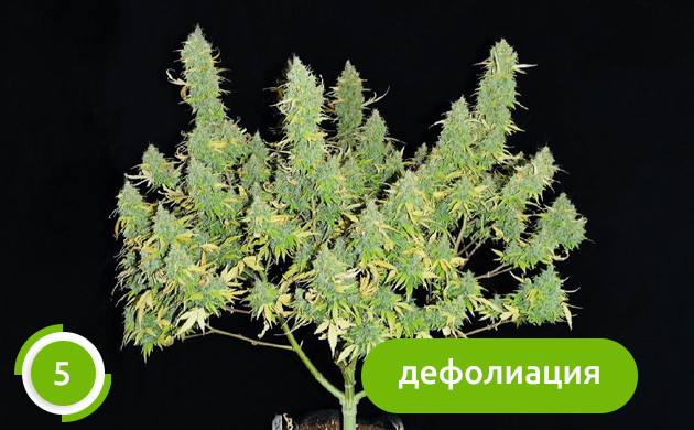 - Пятый этап. Когда крона станет слишком густой, можно прибегнуть к дефолиации. Удаление крупных веерных листьев на этом этапе позволит воздушным массам лучше проходить через крону каннабиса, а значит, и вероятность возникновения плесени и гнили на бутонах сведется к минимуму. При этом свет сможет проходить до самых нижних ярусов куста.