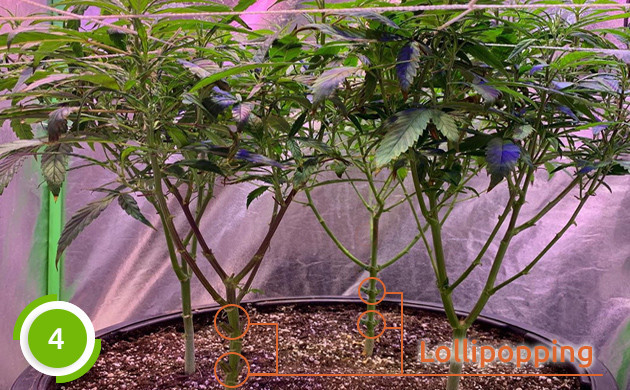 - Четвертый этап. Через неделю после суперкроппинга можно применить технику Lollipopping. Она предусматривает удаление мелких потенциально бесполезных ветвей, которое приведет к более активному развитию верхних крупных соцветий.