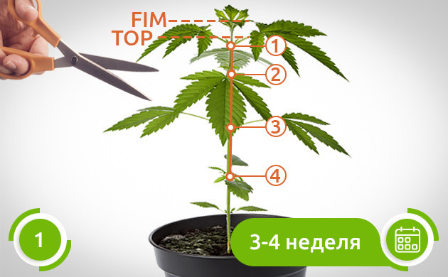 - Первый этап. Обычно это 3-4 неделя, когда на кусте уже сформировано 4 полноценных узла. Начинаем с обрезки верхушки растения по технике топпинг или фимминг. Эта манипуляция приостановит вертикальный рост и простимулирует формирование боковых ветвей.