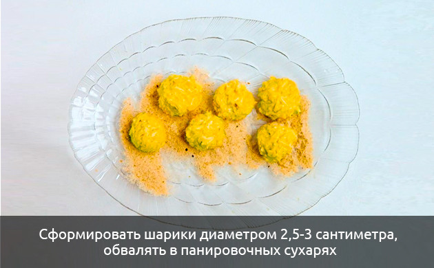 6. Из получившегося теста сформируйте небольшие шарики диаметром 2,5-3 сантиметра. Далее насыпьте панировочные сухари в плоскую тарелку или миску и обваляйте в них шарики со всех сторон.