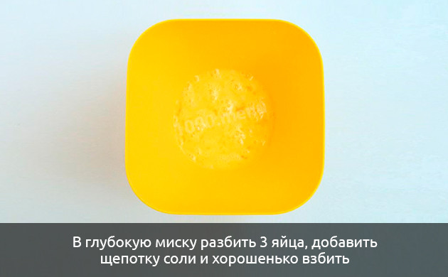 2. В глубокую миску разбейте 3 яйца, добавьте щепотку соли и хорошенько взбейте при помощи вилки или венчика.