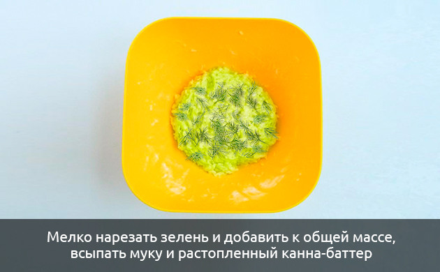 4. Мелко нарежьте зелень (петрушку, укроп или другую на ваш вкус) и добавьте к общей массе. Туда же всыпьте муку и положите предварительно растопленный в микроволновке или на плите канна-баттер.