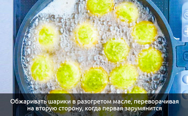 8. Обжаривайте шарики частями в разогретом масле, переворачивая на вторую сторону, когда первая зарумянится. Если шарики темнеют слишком быстро, убавьте немного огонь.