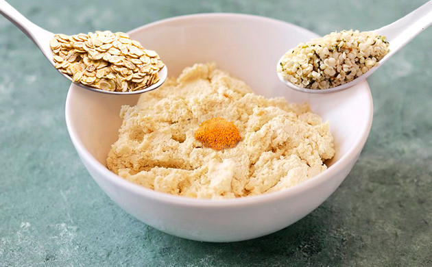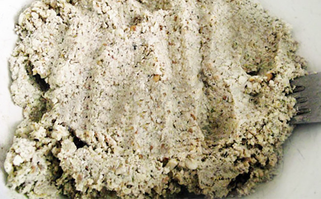 1. Тофу протирается через сито и смешивается с конопляным семенем, овсянкой и специями.