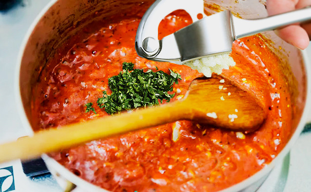 3. Томатному соусу нужно дать повариться еще 5 минут, после чего добавить измельченные чеснок и травы, чуть-чуть потомить и можно снимать с огня.