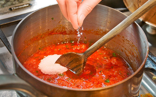 2. Полученная томатная масса варится на медленном огне в течение 5 минут при постоянном помешивании, после чего в нее добавляются соль, сахар, масло, и все тщательно перемешивается.