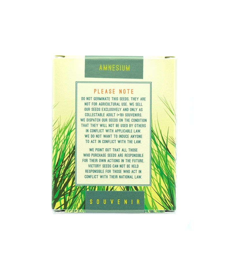 Феминизированный сорт марихуаны Amnesium был создан после того, как его старшая регулярная сестра начала купаться в лучах славы. Ее репутация во всех кофешопах была на высоте, а потому многие гроверы требовали исключительно женского растения. Для его создания использовались такие знаменитости, как Haze и Northern Lights. Работа не прошла даром - вскоре после выхода в свет публика нашла себе нового любимца.