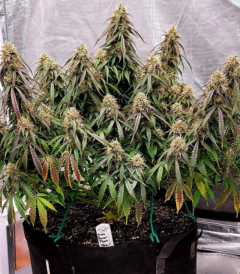 Цикл от семки до харвеста сорт проходит всего за 12 недель. Растения отличаются крупными тяжелыми соцветиями, что сделало Auto Power Plant популярным среди коммерческих производителей. При правильном уходе показатель урожайности в индоре может доходить до 600 грамм с 1 м2. В открытом грунте урожайность составит до 250 грамм с куста. Конечно, это во многом зависит от погоды и количества солнечных часов в сутки.