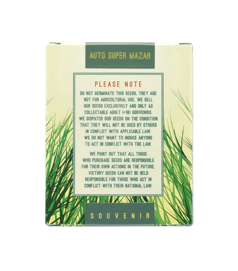 Сорт конопли Auto Super Mazar от Victory Seeds был создан путем скрещивания селекционерами сидбанка одноименного фотопериодного растения со специально отобранным гибридом индики и рудералиса. Оригинальная растишка трижды получала награды на различных конопляных конкурсах за обильную урожайность и удивительно мягкий вкус.