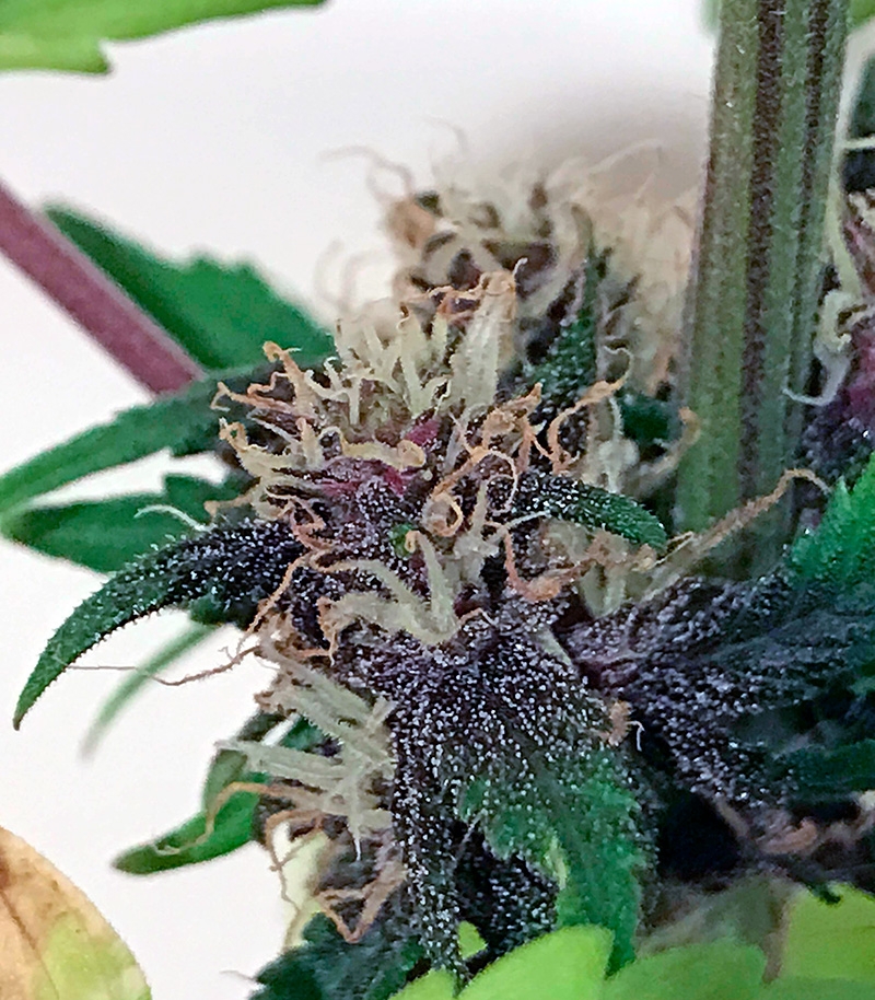 Гибрид невысокий, с сильными второстепенными побегами и короткими междоузлиями, поэтому кажется очень пушистым. Штамм универсальный, подходит для разведения на улице, в теплице и комнате, в т.ч. в очень стесненных условиях. Все кусты с возрастом синеют и выглядят крайне экзотично. Чем ниже температура среды, тем интенсивнее фиолетовые и пурпурные тона.