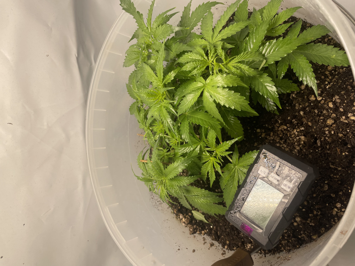 Первый раз тренирую LST. С одного ведра 50 литров получится хорошая пальма. Заметил чем больше субстрата тем больше корней. А значит и дерево будет огромное. Один минус,кормить много нужно при большом объеме и следить за сливом в лотке. Я задержал Вегу на неделю минимум. Лил на 4 неделе компот 700-800ппм (биобизз вся линейка с бактериями.) боялся перекормить и не смотрел на слив. Растение тормознуло жестко,когда проверил был 220-230. Неужели так жрет? Пришлось лить компот по 1000ппм огромным объемом с паузами и чередованием с чистой водой чтобы не сжечь (уже на опыте печальном) слив стал 450ппм. Сегодня пролил 1000ппм растению 40 дней от каски. В общем если много субстрата то нужно постоянно уделять время на анализ. Без датчиков делать нечего здесь. Спасибо большое за поддержку горячей линии Семяныча. До этого много сортов поднимал но этот особенный. Если накосячил с удобрениями то проливайте чистой водой и он оживает моментом.